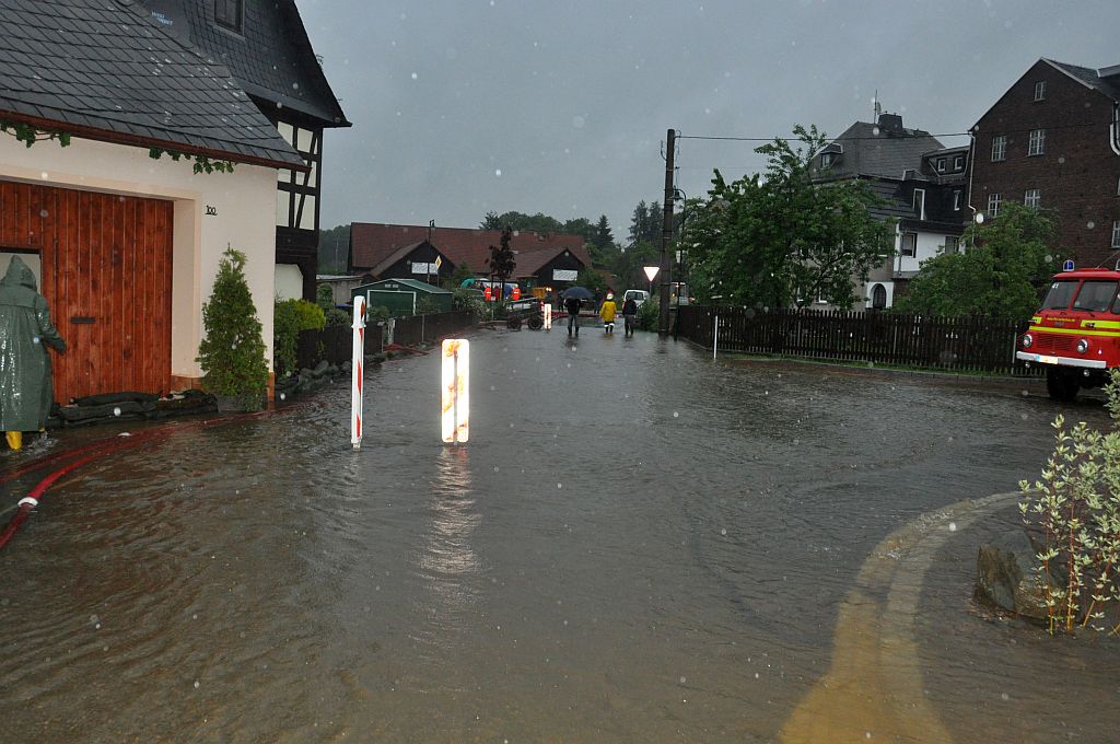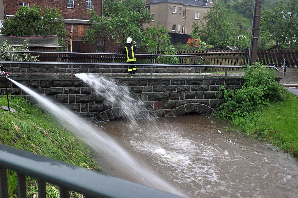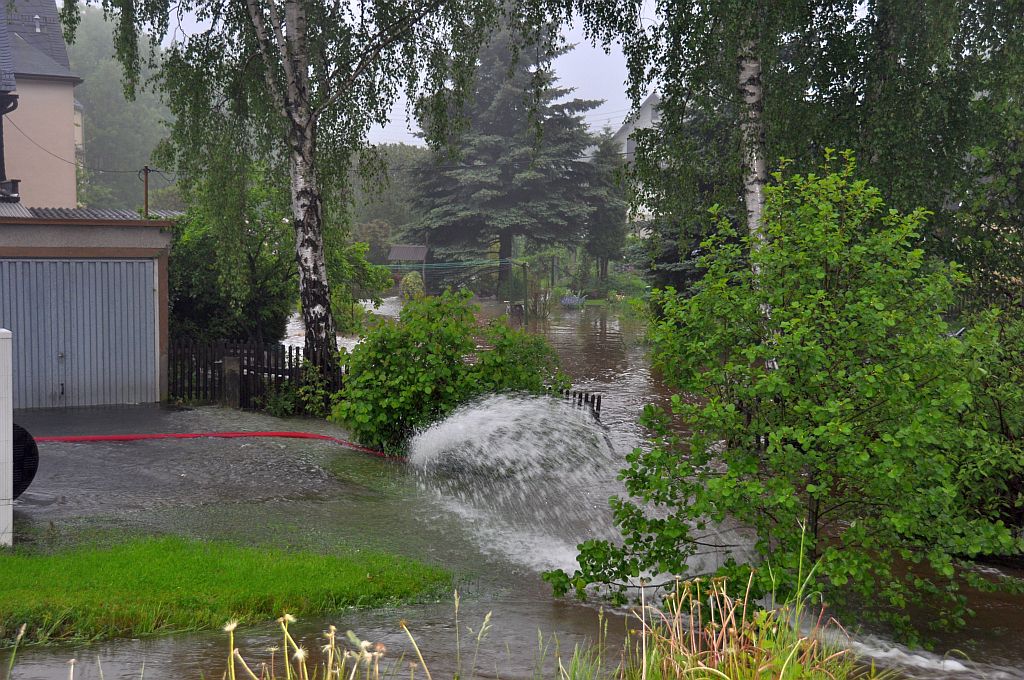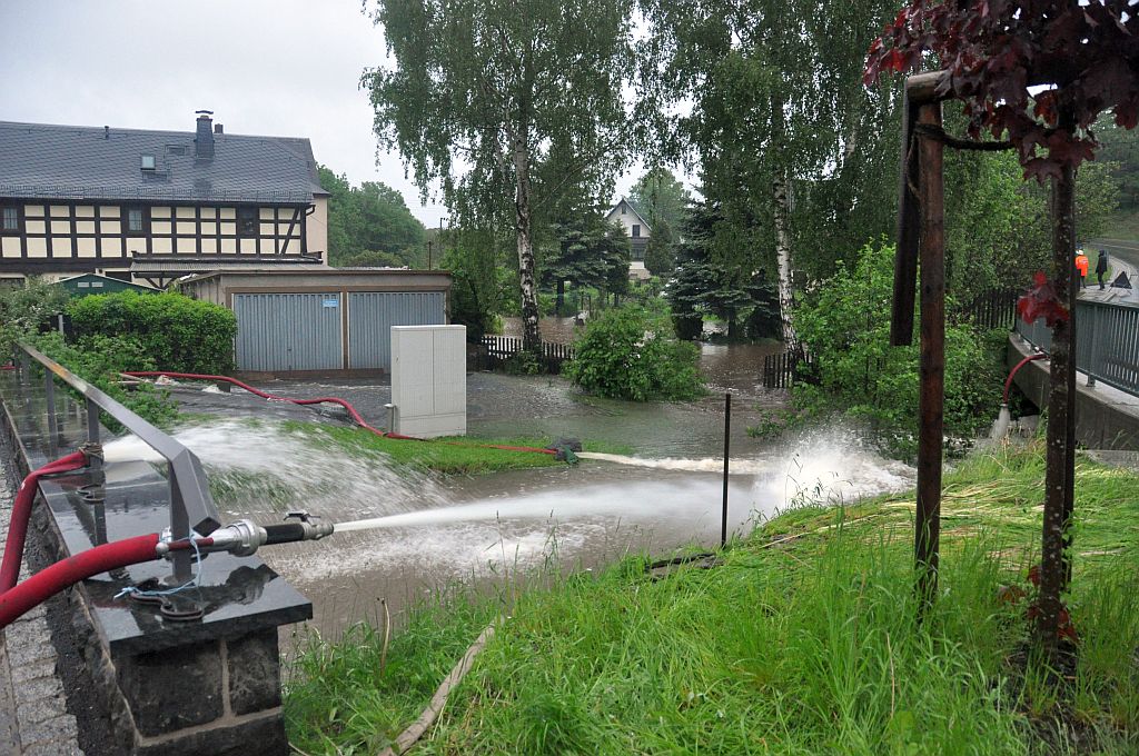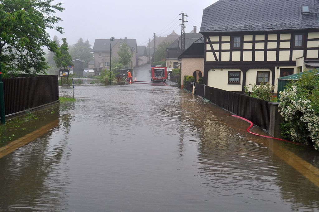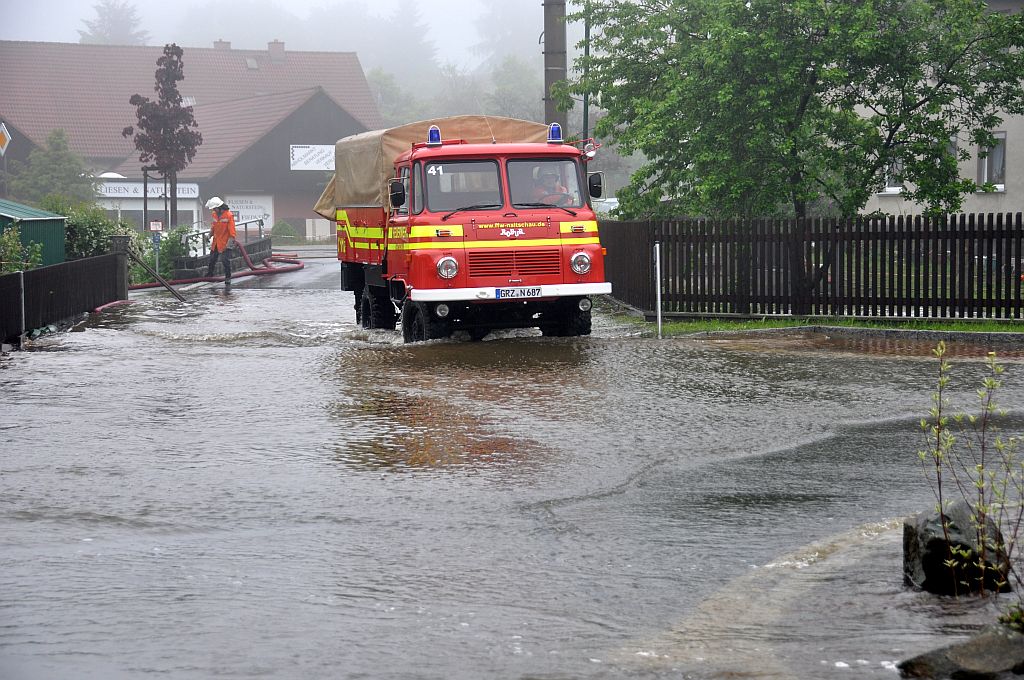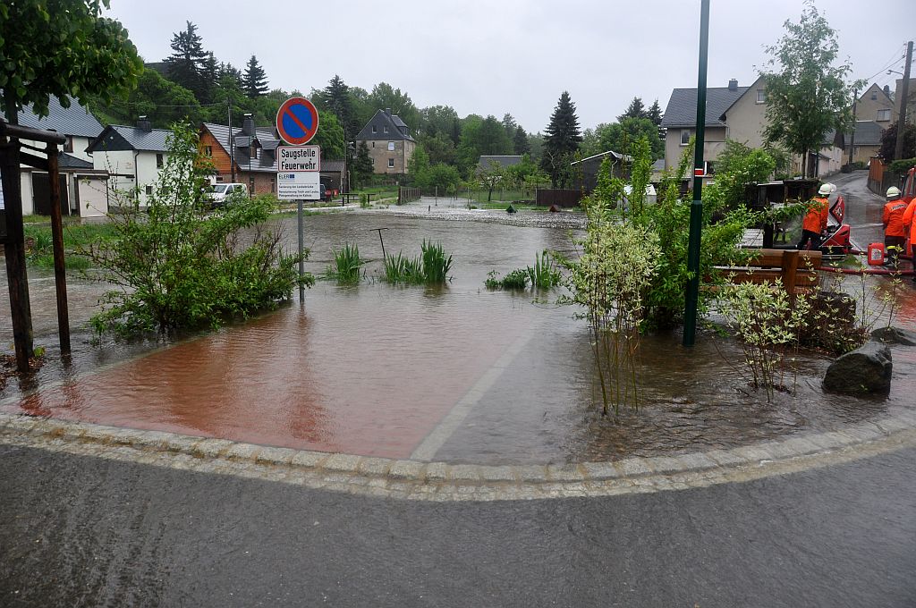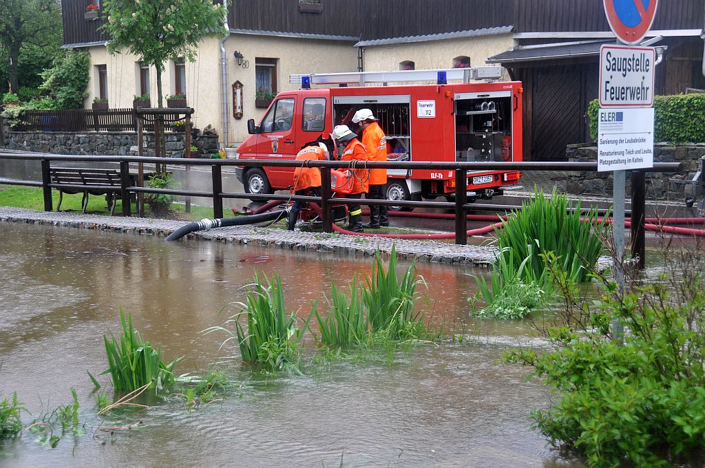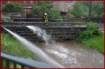 Um 5,24 Uhr wurden die Kameraden zu einem Hochwassereinsatz in den Ortsteil „Kalteis“ gerufen. Der Dornbach und die Leuba waren über die Ufer getreten. Eine Wohnung und mehrere Keller waren vollgelaufen. Von den Kameraden wurden die Wassermassen umgeleitet und abgepumpt. |