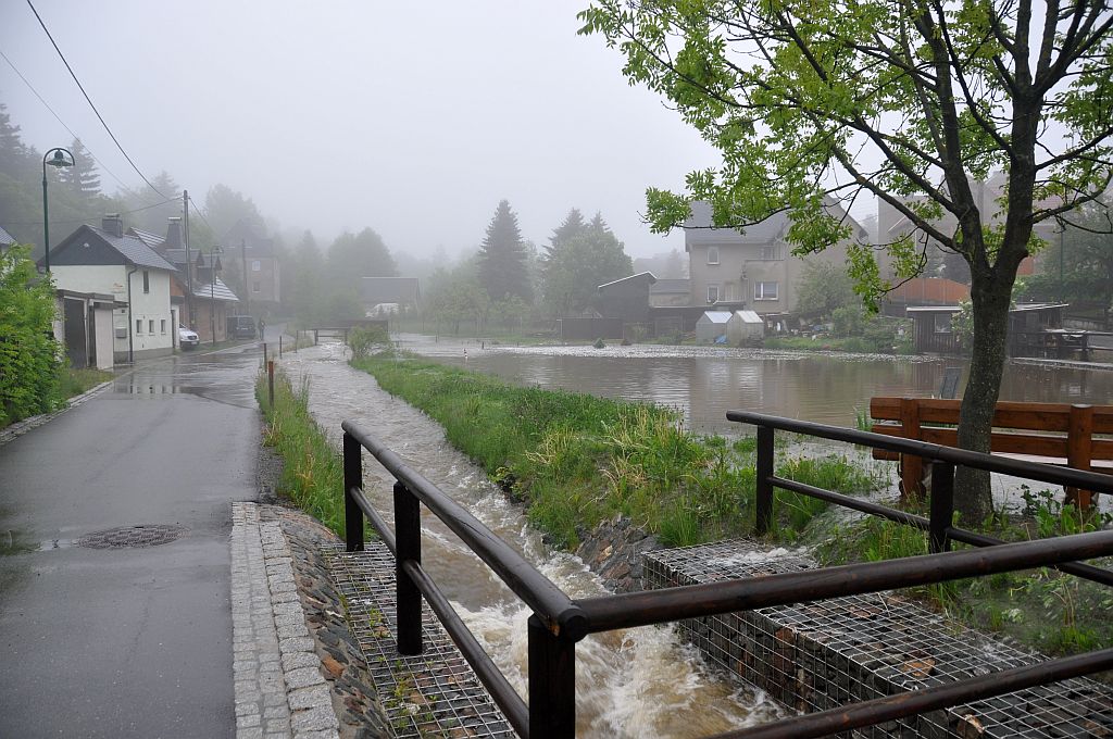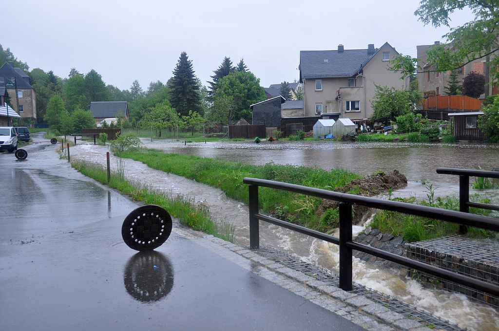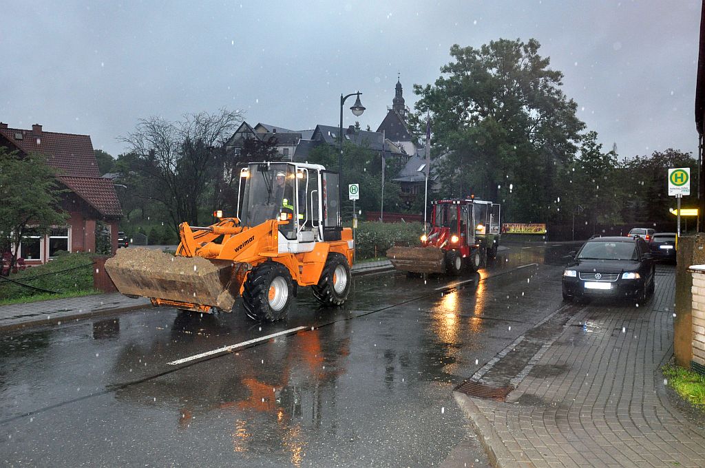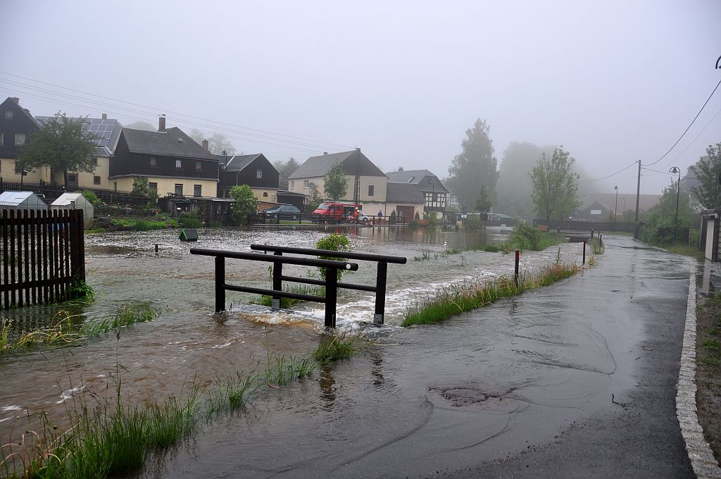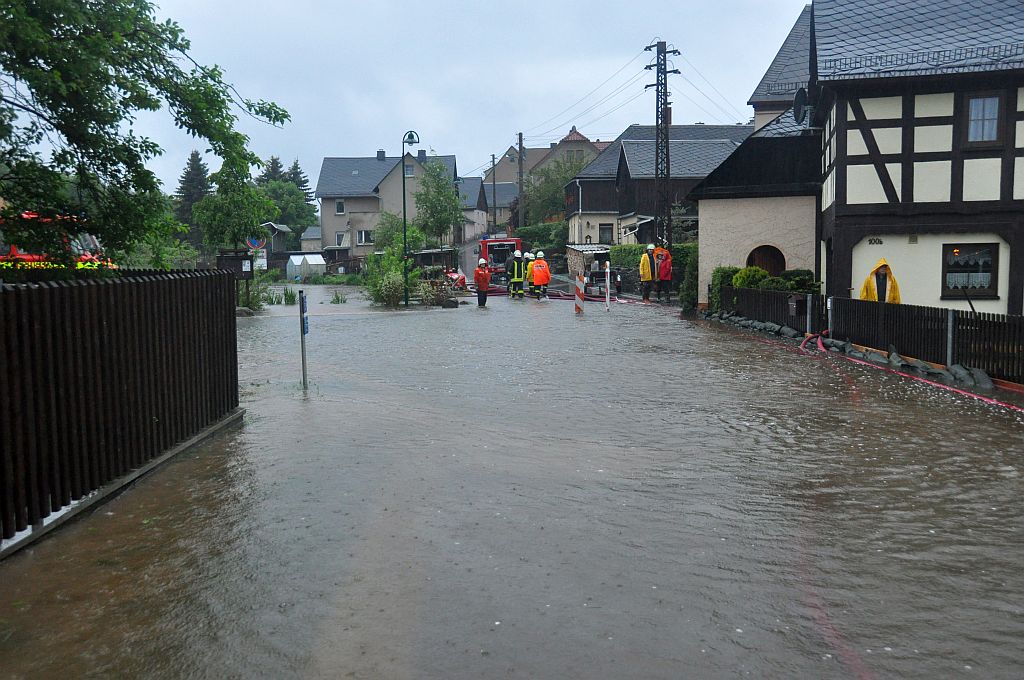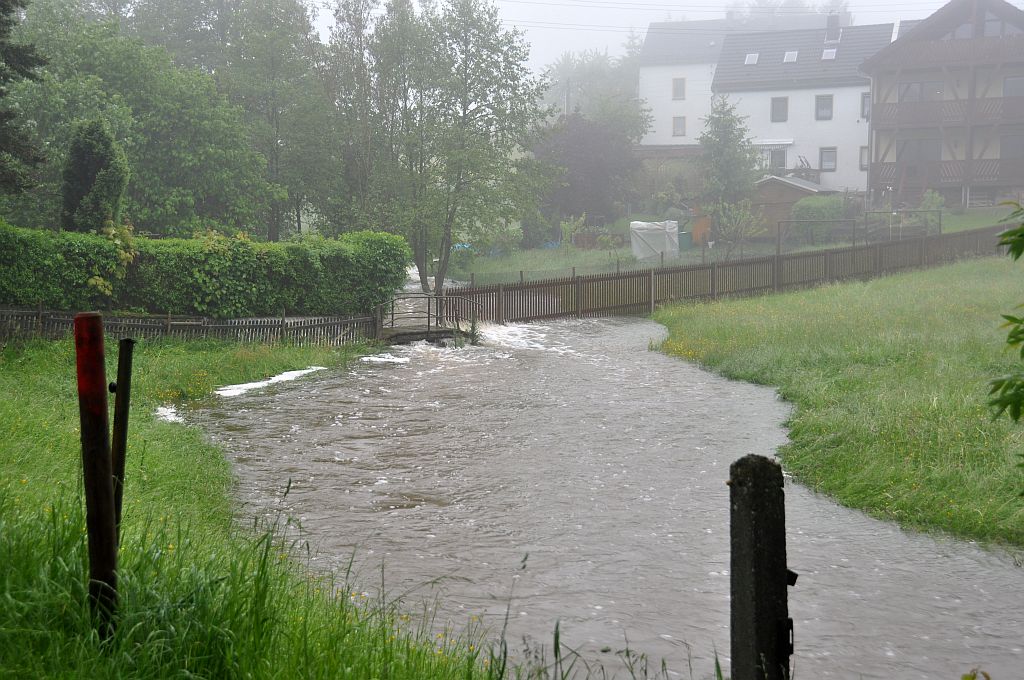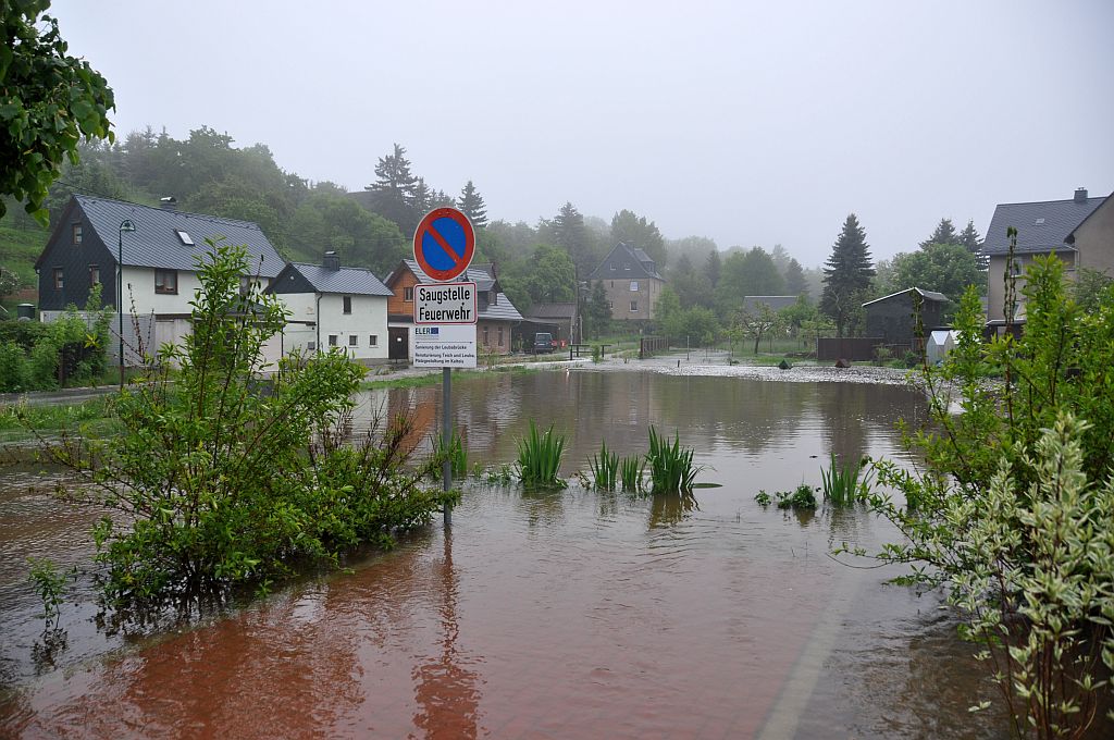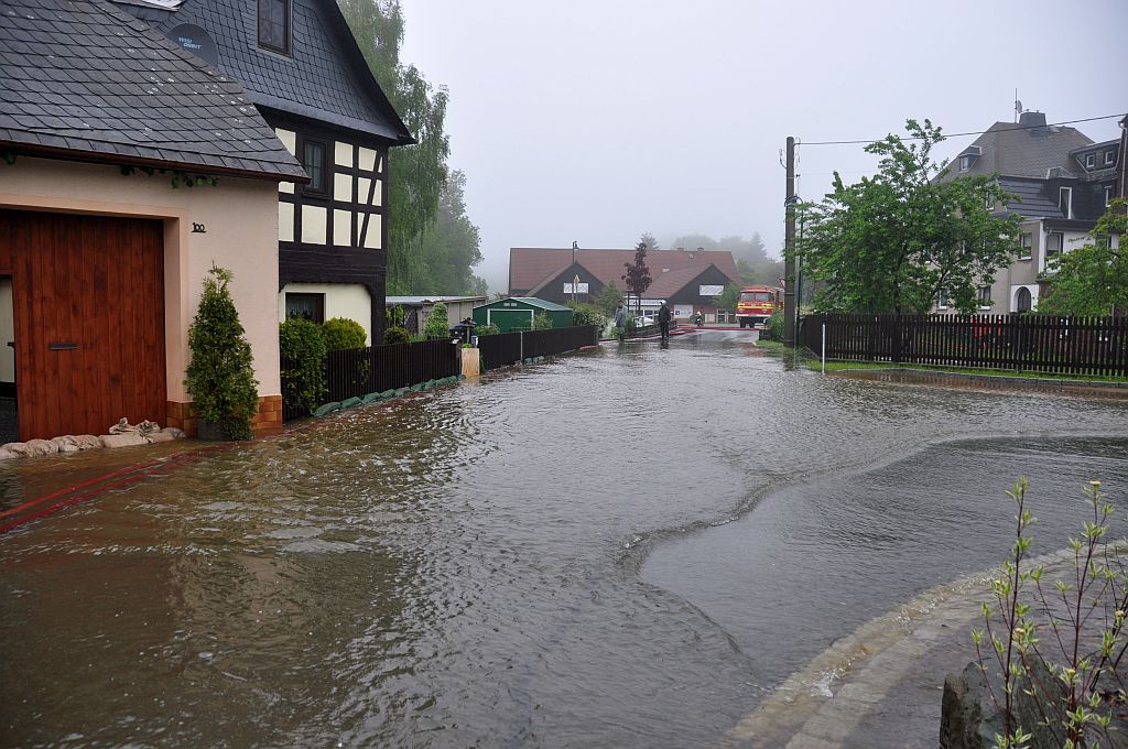Um 5,24 Uhr wurden die Kameraden zu einem Hochwassereinsatz in den Ortsteil „Kalteis“ gerufen. Der Dornbach und die Leuba waren über die Ufer getreten. Eine Wohnung und mehrere Keller waren vollgelaufen. Von den Kameraden wurden die Wassermassen umgeleitet und abgepumpt. |