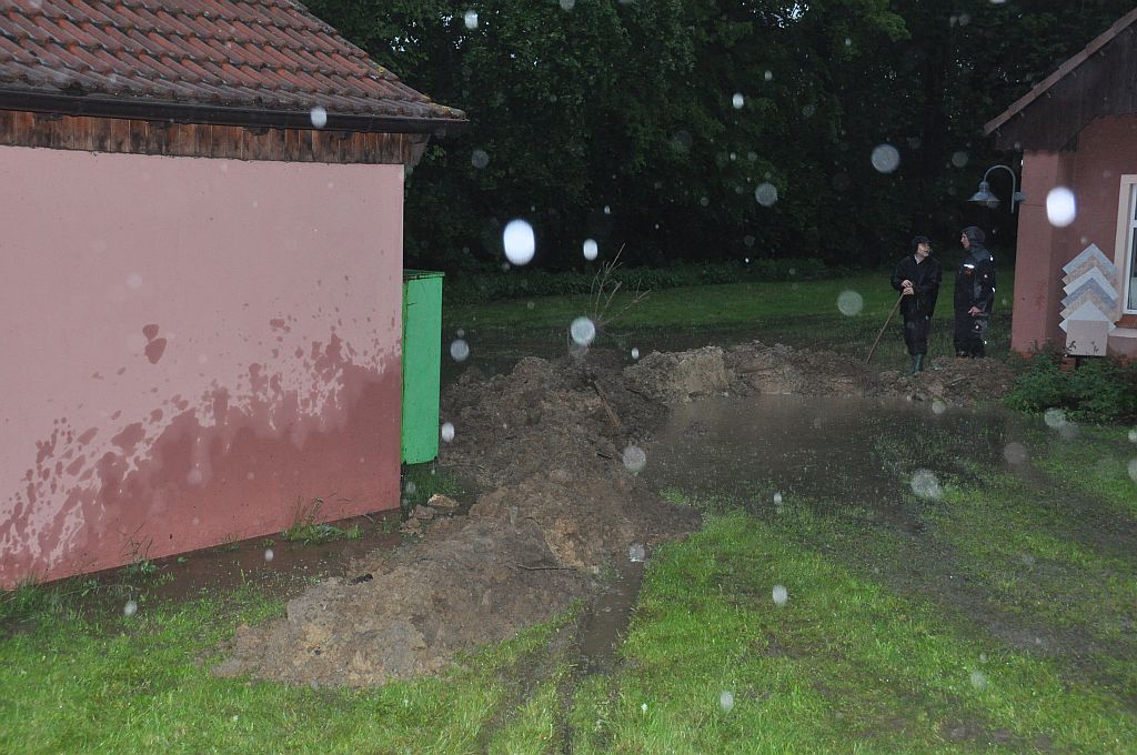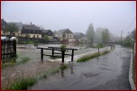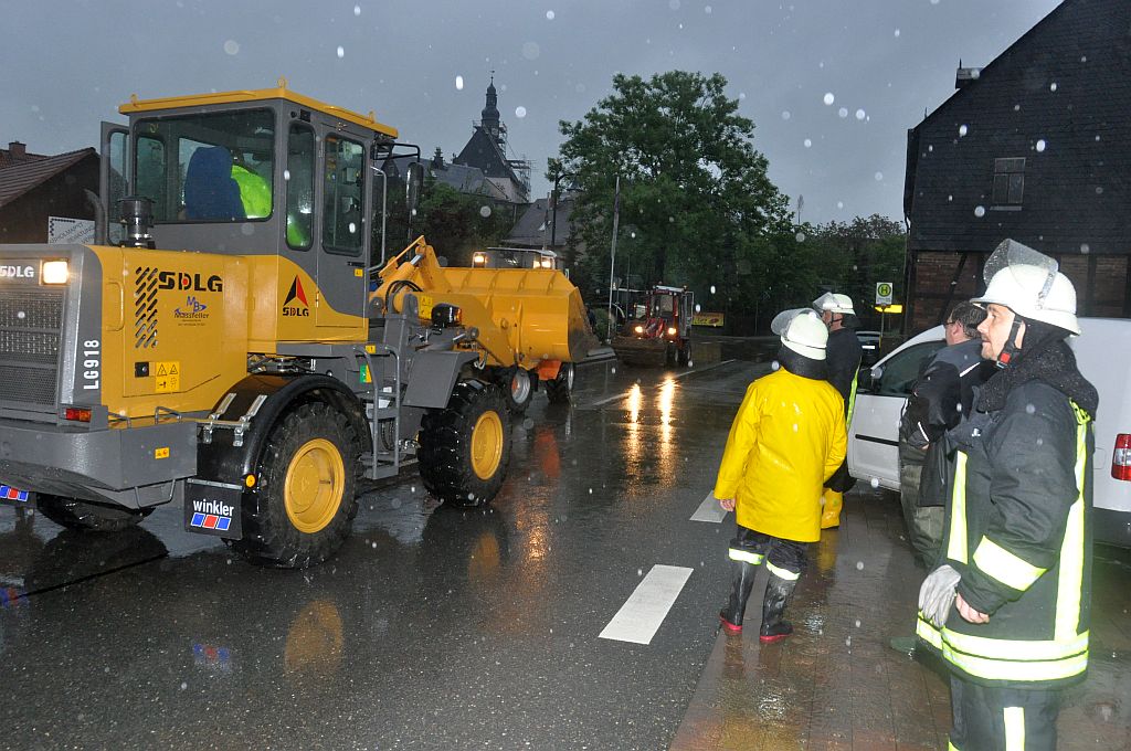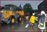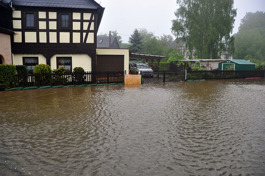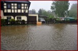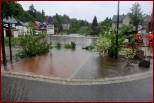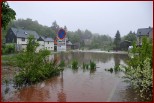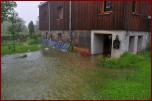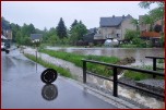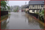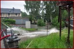 Um 16.30 Uhr rückten die Kameraden wieder zum Hochwassereinsatz in den Ortsteil „Kalteis“ aus. Der Dornbach und die Leuba waren über die Ufer getreten. Das Wasser stieg diesmal noch höher als zwei Tage vorher. Der Schwerpunkt lagl bei der Sicherung einer Trafostation um das Abschalten des Stromes zu verhindern. Mit schwerem Gerät wurde ein Damm aufgeschüttet und mit Sandsäcken die Tür gesichert. Eine Pumpe in der Station verhinderte das weitere Ansteigen des Wassers. |
