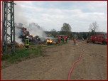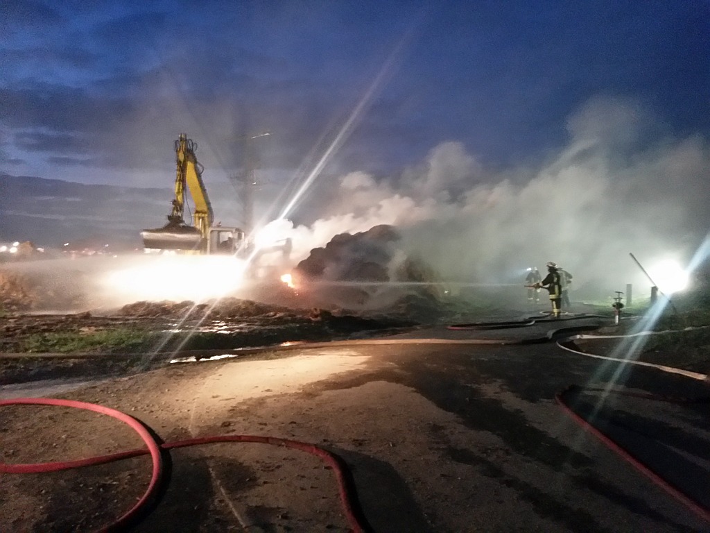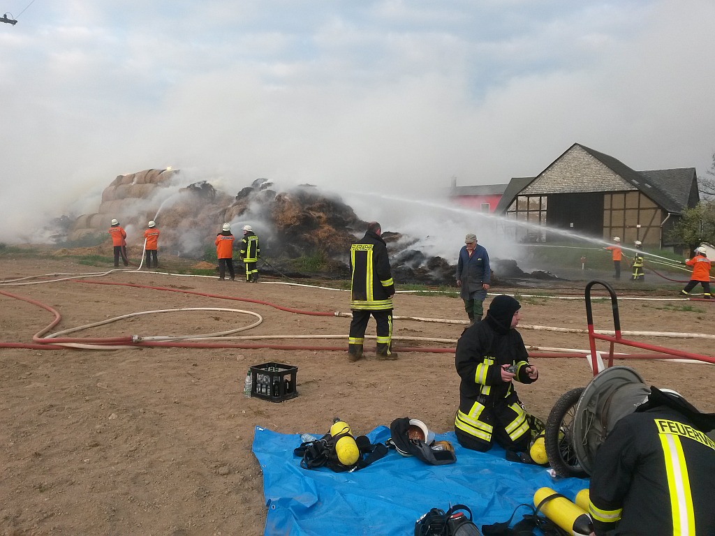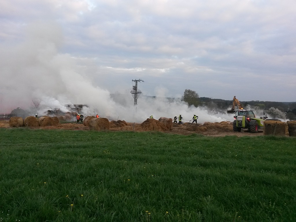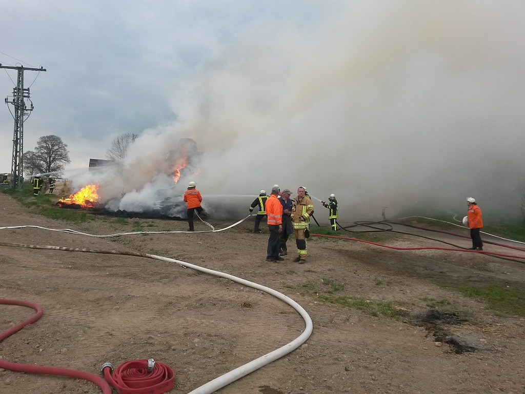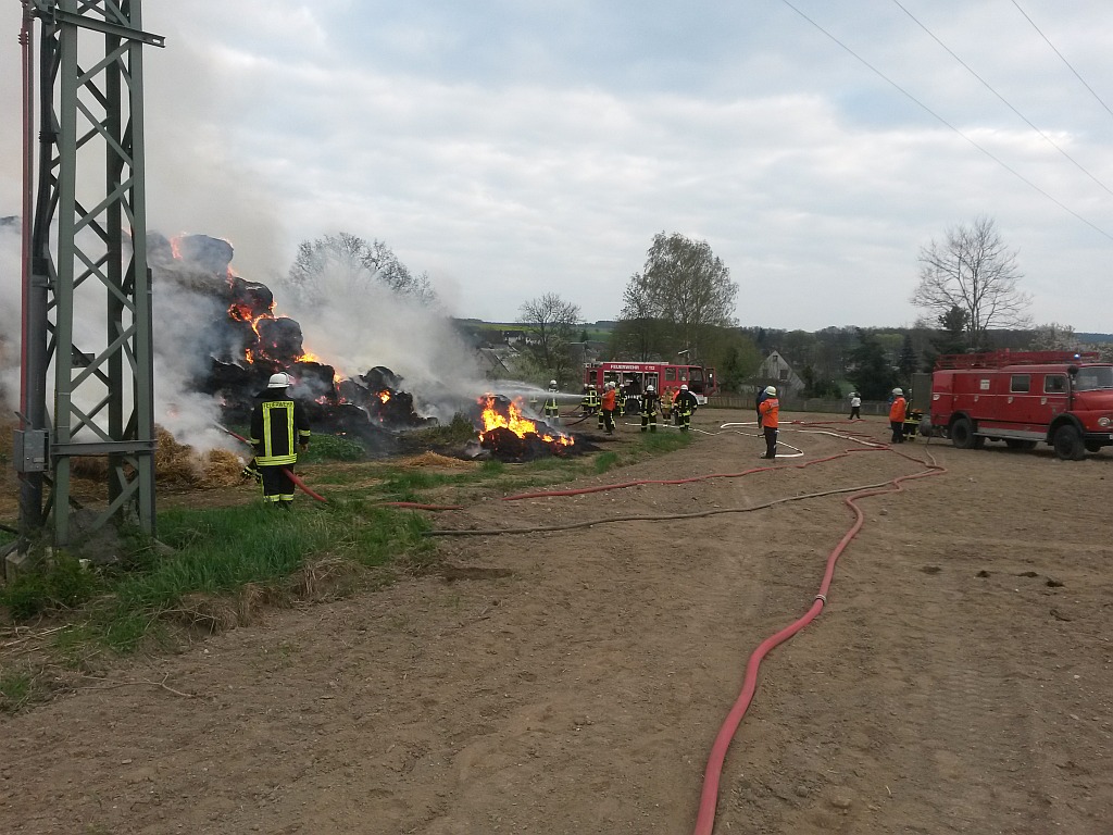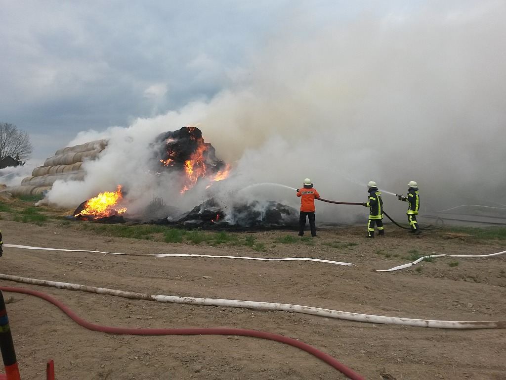 Um 17.46 Uhr wurden wir zu einen Brand einer Strohmiete mit ca. 500 bis 600 Strohrollen nach Langenwetzendorf gerufen. Nach dem Aufbau einer Wasserversorgung über 540 Meter konnten wir mit dem Löscharbeiten beginnen. Mit schwerer Technik wurde das Strohlager auseinandergezogen und abgelöscht. |