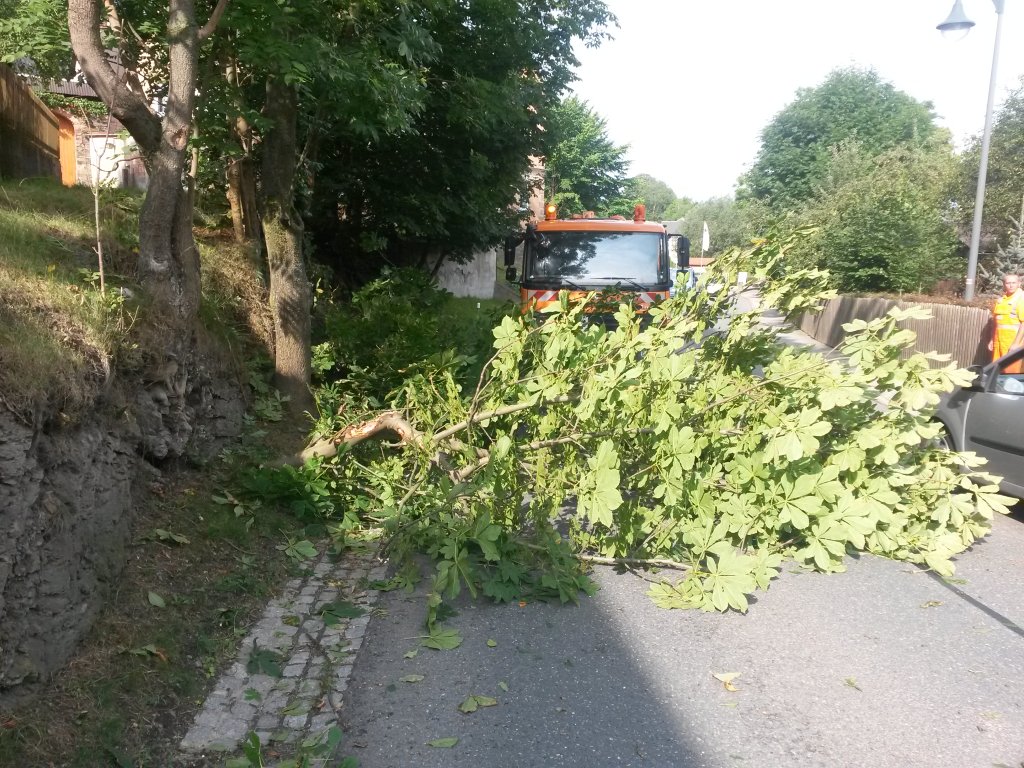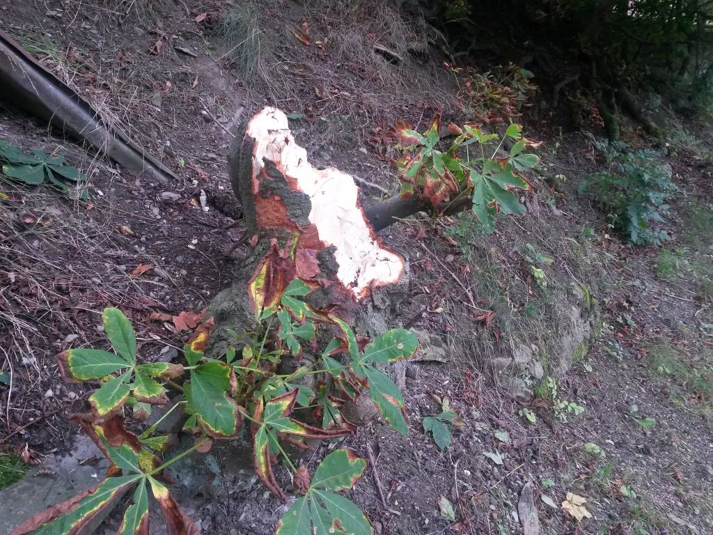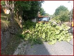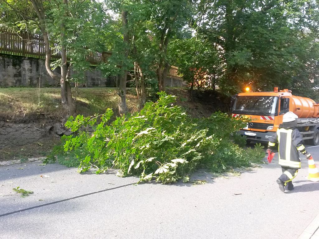 Um 09.38 Uhr wurden wir zu einen auf der B 94, mitten im Ort liegenden Baum, gerufen. Ein großer LKW hatte zuvor eine an einem Hang wachsende Kastanie gestreift. In dessen Folge brach der Baum ab und stürzte auf die Bundesstraße. Ein nachfolgender LKW konnte gerade noch rechtzeitig bremsen und eine Kollision verhindern. Trotz aufgefundenen Fahrzeugteil vom verursachendem LKW setzte der Fahrer ohne anzuhalten die Fahrt fort. Die Kameraden unsere Feuerwehr sicherten die Gefahrenstelle ab und entfernten den Baum. |