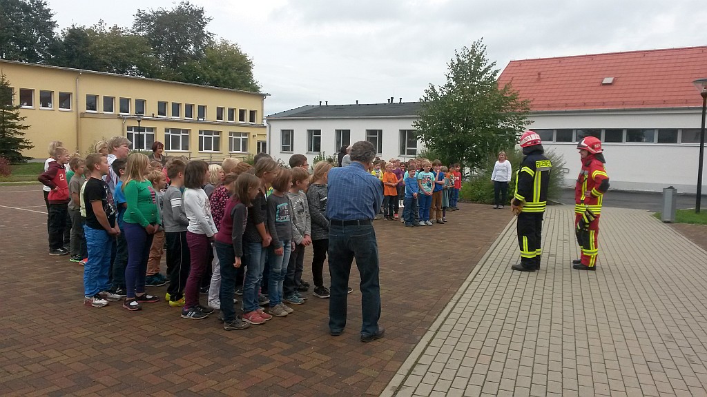 Am 23.09.15 führten wir eine Einsatzübung in der Grundschule Naitschau durch. Zweck der Übung war die Evakuierung der Schule über die vorhandenen Rettungswege zu üben. Durch den Einsatz einer Nebelmaschine musste von den Lehrern und Schülern der richtige Fluchtweg gewählt werden, was sehr gut geklappt hat. In unter 2 Minuten war die Schule evakuiert. Im Anschluss wurde die Gelegenheit genutzt Lehrer und Schüler im richtigen Umgang mit dem Feuerlöscher zu unterweisen und natürlich konnte auch gelöscht werden. Einen weiteren Bericht finden Sie hier.. | |||||