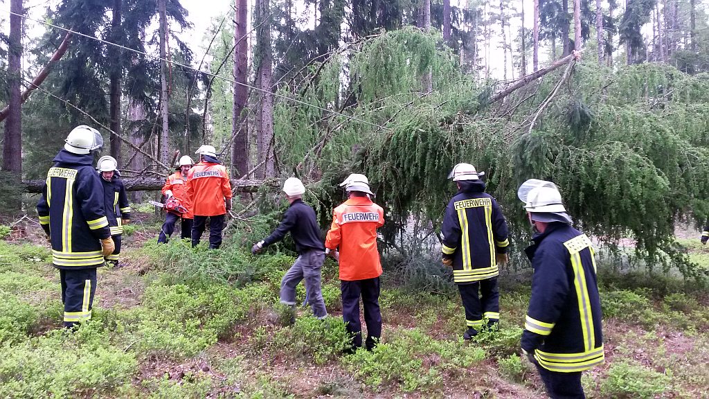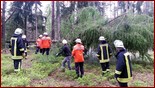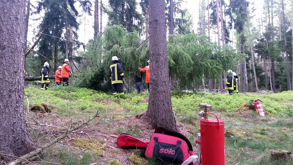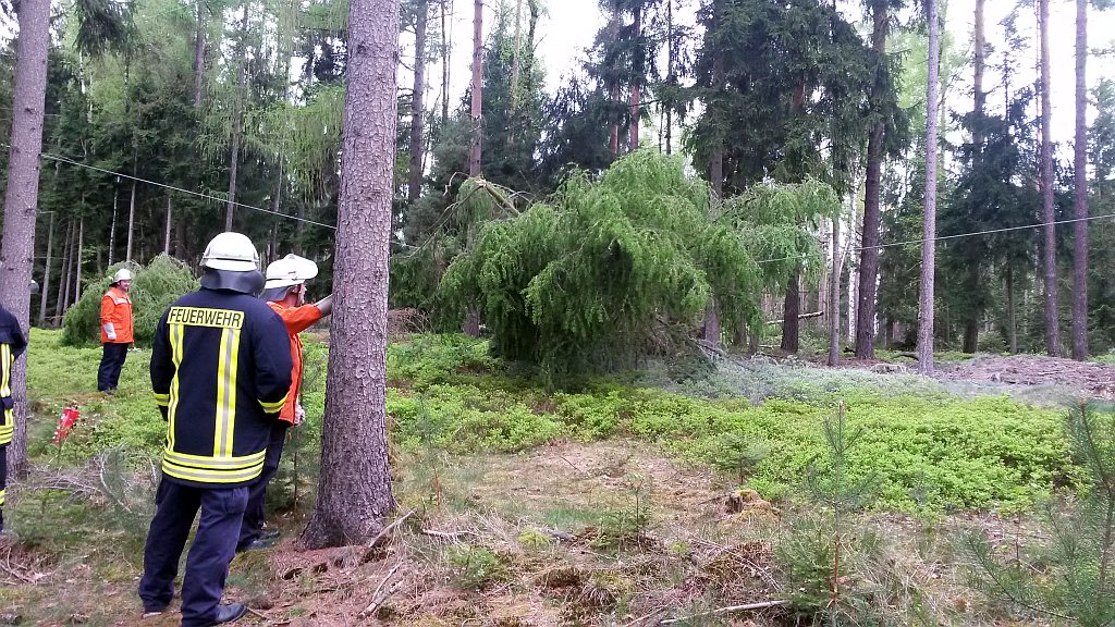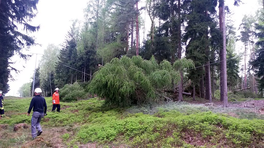 Um 7.08 Uhr bekamen wir den Einsatzbefehl "Umgestürzter Baum auf Freileitung" Als wir die Einsatzstelle erreichten war die Feuerwehr Wellsdorf schon vor Ort und der Energieversorger schon über die Leitstelle informiert. Es handelte sich um eine 20 KV-Leitung die nicht gerissen war aber bis auf 2 Meter vor dem Boden von 2 Bäumen heruntergedrückt wurde. Eine leichte Flammenbildung war zu erkennen was uns veranlasste das TLF der Feuerwehr Langenwetzendorf nachzufordern. Nach dem abschalten der Leitung durch den Energieversorger wurden die Bäume vorsichtig entfernt. Noch vorhandene Glutreste wurden abgelöscht. | |||||