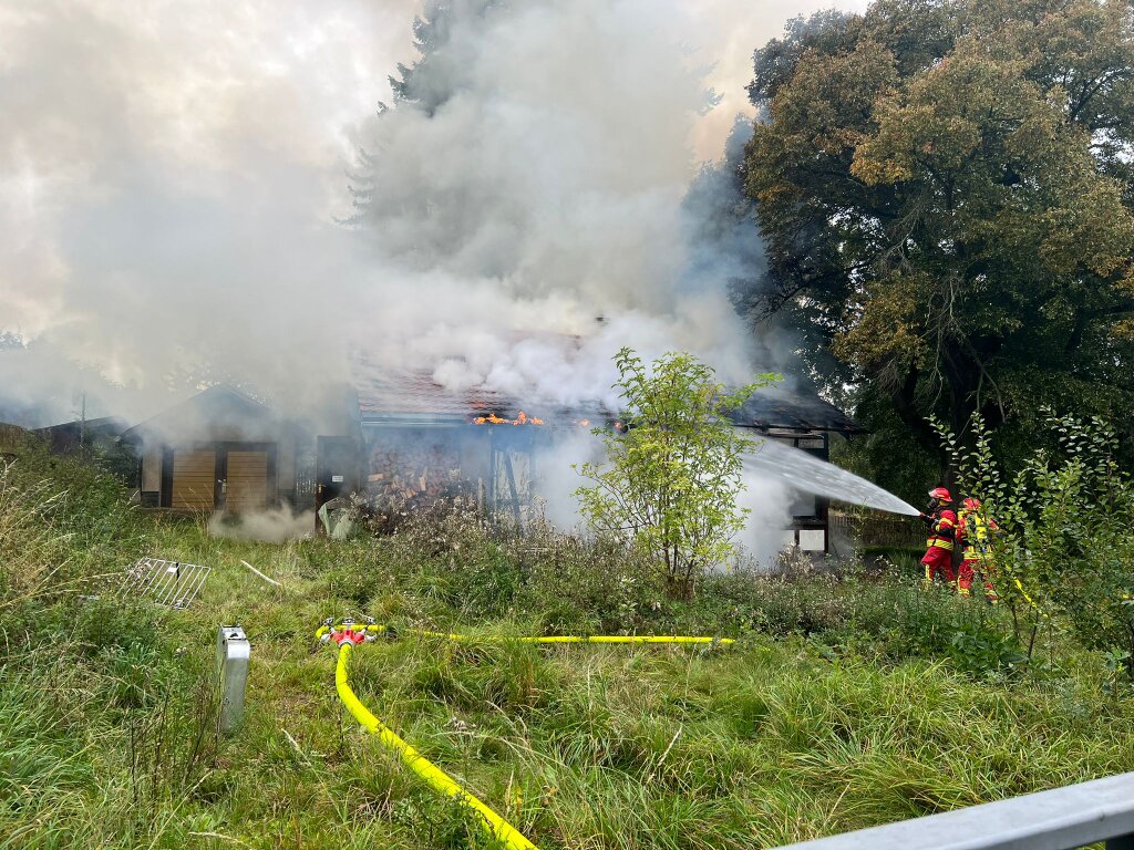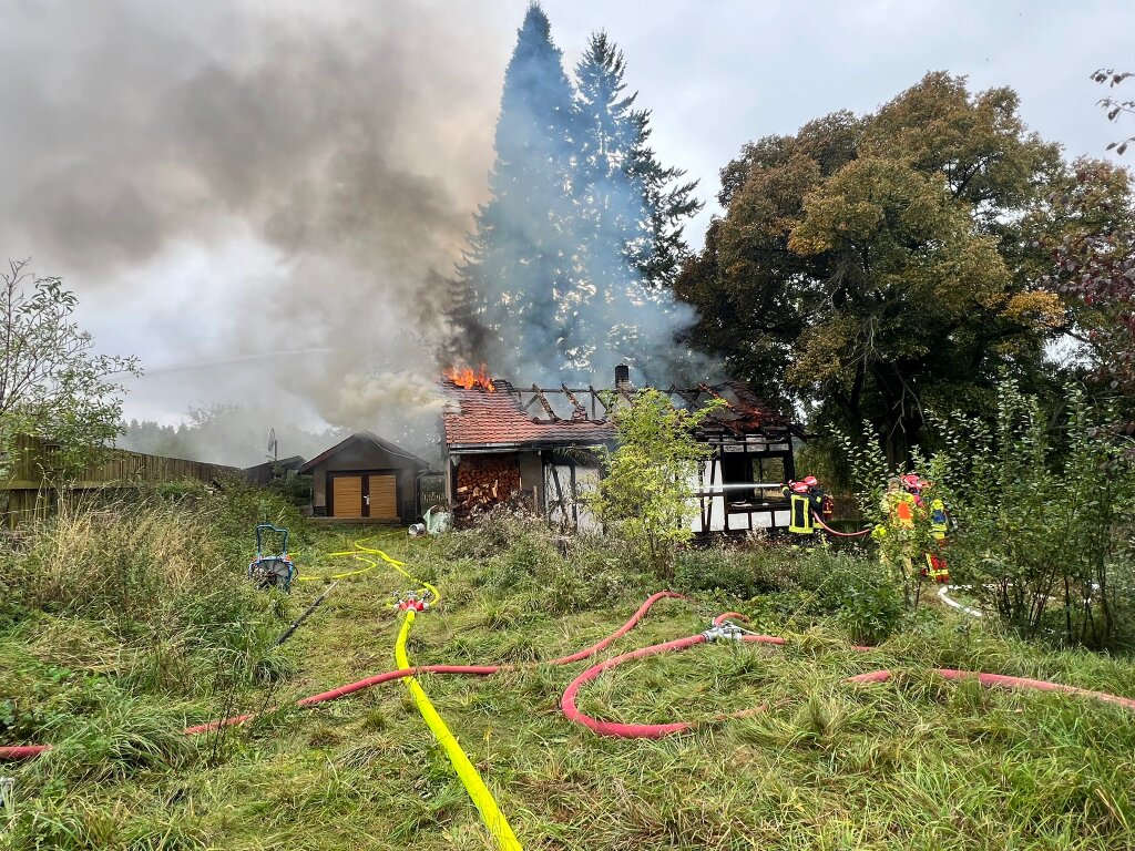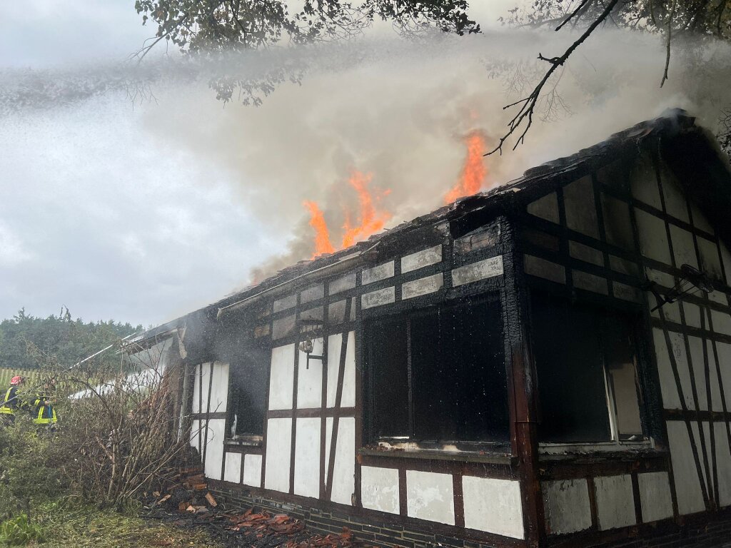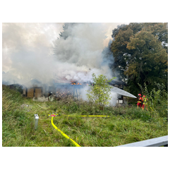 Am Samstagmorgen wurden wir zu einem Brand eines lehrstehenden Hauses nach Wellsdorf gerufen. Schon auf der Anfahrt war eine Rauchsäule zu erkennen. Bei Eintreffen am Einsatzort, schlugen schon die Flammen aus dem Dach. Zuerst wurden die Wasservorräte der Wasserführenden Fahrzeuge genutzt um die Zeit für den Aufbau einer stabilen Wasserversorgung zu überbrücken. Im laufe des Einsatzes wurde entschieden das Gebäude mit einem Bagger abzureisen. |